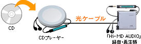 リニアPCMモードとは、音源を圧縮せずに、高音質なまま記録できる機能。お気に入りの音楽CDのバックアップ用などに最適です。「Hi-MD AUDIO」録音・再生機とCDプレーヤー*を光ケーブルで接続し、直接録音できます。手軽な操作で、高音質なサウンドをお楽しみいただけます。