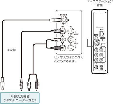 ベースステーションにテレビアンテナ、外部入力機器(HDDレコーダー)、回線を接続し、電源を入れる |