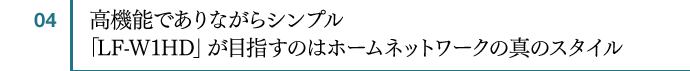 「LF-W1HD」は、ホームネットワークを簡単に体感できる機種なんです。どうしてもホームネットワークという言葉は、ネットワークありきになってしまう。そこにはIPアドレスを割り振ったり、設定をしたりと、複雑感が拭えません。その概念を打ち破りたかったんです。 |