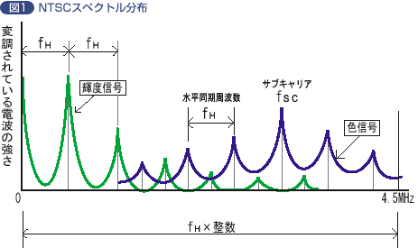 | NTSC方式では、輝度信号と色信号、同期信号を一本に組み合わせてコンポジット信号を作ることで、モノクロ/カラーの両方に対応しています。輝度信号と色信号を同時に送るため、図1のように、輝度信号と色信号のピークが交互になるように工夫されています(周波数インターリーブ)。 |
