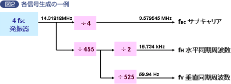 なお、制作機器の内部では、それぞれの周波数関係を正しく保つために、1つの発振器から分周して各信号がつくられています。 |