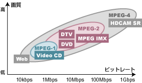 | MPEGとは本来マルチメディア符号化を行っている組織の略称ですが、最近では動画圧縮における国際規格の呼び名としても使われています。MPEG規格はもともと、蓄積メディア、放送、通信などのためのマルチメディア符号化の規格でしたが、MPEGのフェーズが進むにつれ、より広範囲な内容を含むものとなっています。 | ![]() ※MPEG-3はHD信号を取り扱うものでしたが、MPEG-2に統合されたので欠番となっています。 |