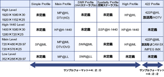 | MPEGには、信号(ビットストリーム)の互換性を保つための仕組みとして、レベルとプロファイルと呼ばれる尺度があります。 |