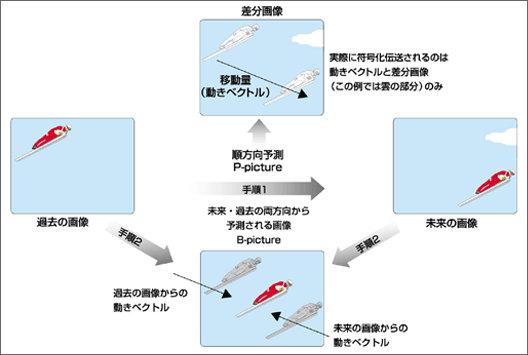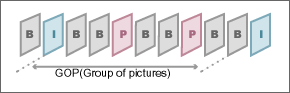 | モーションJPEGでは1フレーム毎の圧縮を行っていますが、MPEGでは高圧縮率に対応するため、フレーム間の差分情報を用いて圧縮することが可能です。 MPEGは3種類のフレームデータを混在させ、通常は15フレームを1つのグループとして取り扱っています。 |