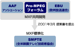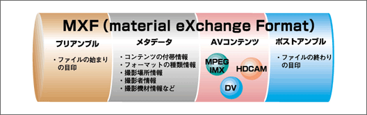 | MXF(Material eXchange Format)は、Pro-MPEGフォーラムにより開発されたファイル交換フォーマットです。開発後、AAFアソシエーション、EBUとの共同開発プロジェクトにより高機能化され、現在、国際標準化機関「SMPTE」で標準化作業が進められています。 MXFは、圧縮方式や信号フォーマットに依存しないファイル交換フォーマットのため、インターネット、LANなどのストリーミング可能な環境にファイルを転送することで、ストリーミング機能を実現。また、MPEG IMX、HDCAM、DVなどのAVコンテンツだけでなく、その内容・種類・撮影場所・撮影機材など番組/CM制作に欠かせないメタデータも一体化して送ることが可能です。 撮影から編集、送出、アーカイブまでをファイルで一元管理することで、制作現場の効率性向上、コスト削減が期待されています。 |