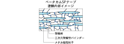 | 架橋密度を50%アップ(当社比)したメタル強化バインダーを採用。テープ塗膜からの粉おちを最小限に抑えることで、カートマシーンの繰り返し走行でも優れた耐久性を獲得しました。さらに新潤滑剤の採用により、ビデオヘッドのロングライフ化にも貢献しています。 |