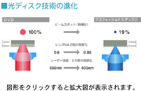 また、数値が大きくなるほど光を絞り込む能力が高くなるレンズのNA(開口数)も、DVDの0.6を上回る0.85とすることで、約2倍の高密度記録を実現しました。