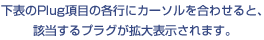 上表のPlug項目の各行にカーソルを合わせると、該当するプラグが拡大表示されます。 |