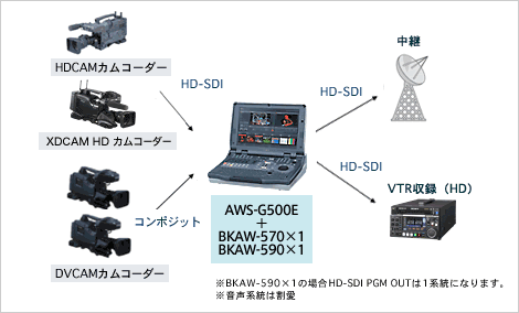 例えばBKAW-590を3枚使用し、HD-SDI6入力、3PGM出力のHD-SDI仕様にすることも、コンポジットとHD-SDI、XGAを使用したSD/HD/PC混在仕様にすることも可能です。