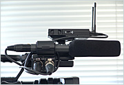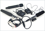 ワイヤレスマイク一式、ガンマイクが2本で1本はステレオ、もう1本はモノラル。無指向性マイクが1本、それにヘッドフォンにイヤホン。