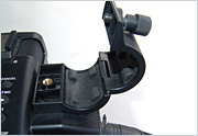 ルーズな状態を嫌うカメラマンが時として下の写真のように布を挟み込んでがっちり固定しているのを見るけど、特にテープ・ディスク記録のカムコーダーではモーターの振動が伝わりやすくなるから、これはNGなんだ。 |