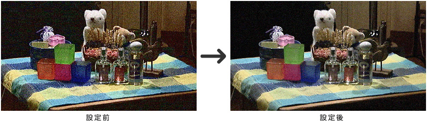 −側に設定するとシャープな映像になり、+側に設定すると映像の粗さが軽減されます。"設定後"の映像では、+98 に設定されています。