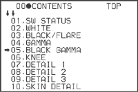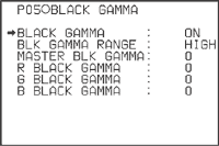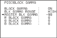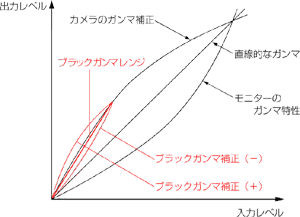 カメラのガンマのうち、黒部分や黒に近い(暗い)部分だけを調整する機能です。この機能を使って、黒部分や黒に近い部分の入力信号と出力信号の度合いを調整する(ガンマカーブのブラックガンマ部分を上げ下げする)ことで、映像の黒や黒に近い部分の階調や色合いを調整できます。 ソニーのカメラでは、BLK GAMMA RANGE(ブラックガンマレンジ)でLOW、L.MID、H.MID、HIGHのどの範囲でブラックガンマを調整するかを決めてから、MASTER BLK GAMMA(マスターブラックガンマ)を−99から+99の範囲で設定します。