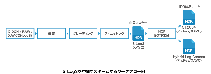 一方、HDRコンテンツ制作のフィニッシングプロセスでは、放送用、OTT*1用、シネマ/ Ultra HD Blu-ray用など、提供するサービスによって採用しているEOTF*2(規格)が異なるため、それぞれに適した規格に変換して納品する必要があります。つまり、同一のHDRコンテンツであっても、納品先によって、複数のバージョンの完パケを作成することが必要になります。そこでご提案できる一つの手法がS-Log3をEOTFとした中間マスターの作成です。