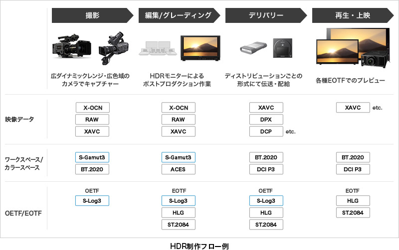 HDR制作には特殊な機材が必要なのか、と尋ねられることがありますが、基本的には既存の製品でHDRの映像制作を行うことが可能です。ただし、魅力的なHDR映像を制作する過程においては、概要「What's HDR」で触れているように、広いダイナミックレンジと広色域で素材を撮影しておくことは留意しておく必要があります。ソニーは優れたキャプチャリング性能を備えたカメラを数多くラインアップしています。”S-Log”に対応したカメラは明暗差の大きなダイナミックな映像を、”S-Gamut”に対応したカメラは鮮やかな色彩まで広い色域でカバーでき、HDR映像制作で求められる要素を十分に満たした映像素材を収録することができます。信号監視やポストプロダクションでのモニターとしては、高輝度・広色域を再現可能なソニーのマスターモニター、ピクチャーモニターをはじめとしたHDR表示モードを備えたモニターを使用します。
