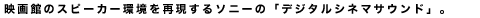 仮想音源定位技術などを駆使し、映画館特有のマルチスピーカー環境や音響を再現。家庭で臨場感あふれるサラウンド音場が楽しめる「デジタルシネマサウンド」を搭載。2本のスピーカーだけで、「背後にもスピーカーがあるかのような」立体的な音場を体感できます。また、「ビットプレイ」では、6つのモードを内蔵し、DVDソフトの内容などに合わせて音場効果を選ぶことができます。 ◎「デジタルシネマサウンド」を6モード搭載 [バーチャル・エンハンスド・サラウンドA/B] フロントスピーカーだけでリアの音を後方に定位させるモード。 ●Aタイプでは後方左右に複数の仮想リア音源を定位。 ●Bタイプでは後方に左右各1個の仮想リア音源を定位。 |