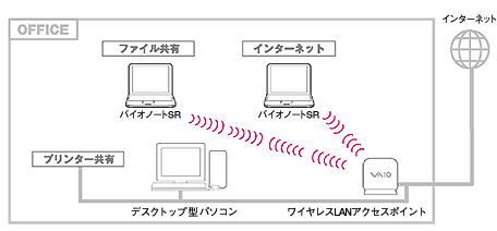 | オフィスに別売のワイヤレスLANアクセスポイントPCWA-A220またはPCWA-A200を設置すれば、ワイヤレスでインターネットに接続できます。ネットワークケーブルの届かない場所で、インターネットを利用したい場合などに便利です。 |