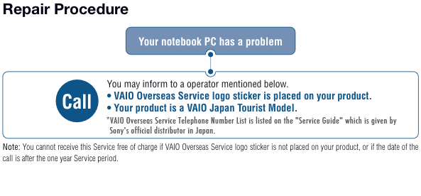 Support and repair under this service apply only to PC hardware unit.The VAIO Overseas Service logo sticker given by Sony’s official distributor must be placed on the computer and contains an actual date of purchase in order to obtain this service. It does not cover software, PC accessories (such as connector cables), and does not include service for instruction manual, label, and other printed materials.