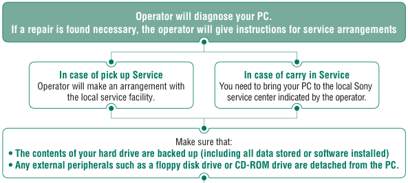 It is your responsibility to back up the contents of your hard drive, including any data you have stored or software you have installed, as well as to remove recording media (such as floppy discs, CDs) and peripherals from the Product before handing over the Product to the Sony-designated pick-up courier. If such programs, data, recording media and peripherals are within the Product at the time Sony receives the Product, Sony assumes that you have forgone all rights to such items. Sony will not be responsible for any damage to or loss of any peripherals, programs, data or other information stored on any media or any part of any Product serviced hereunder.