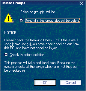Click "OK" button after confirming the status of "Check-In before deletion" check box. When "OK" button is clicked, Group and all the music contents stored in the Group are deleted in MD.