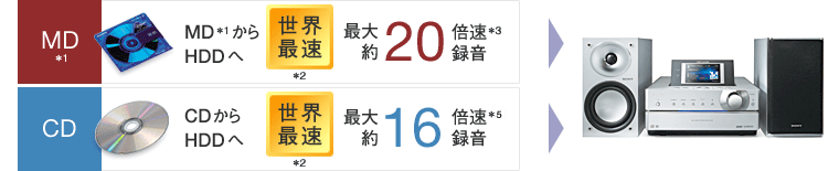 MD*1をスロットにセットして「HDD録音ボタン」を押すだけで、世界最速*2・最大約20倍速*3でHDDに高速録音。MDコレクションをすばやく取りこんで一括管理できます。曲名やアルバム名が入力されていないMDでも、〈ネットジューク〉に取りこめば、自動で曲タイトルを登録*4 。また、CDは世界最速*2・最大約16倍速*5で高速録音できます。