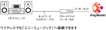 インターネットに接続すれば、〈ネットジューク〉だけで24時間好きなときに音楽をダウンロード。音楽サービス「エニーミュージック」で、最新のJ-POPや話題の洋楽など、高音質で試聴&ダウンロード購入できます。 音楽サービス「エニーミュージック*」 ●シングルやアルバムをダウンロード購入可能 * 利用登録(有料)が必要です |
