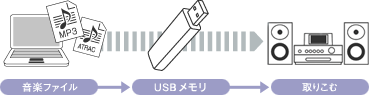 PCに貯めてあるMP3やATRAC*音楽ファイルを、USBメモリを使って〈ネットジューク〉に手軽に取りこめます。 * 著作権保護処理をされていないファイルのみ
