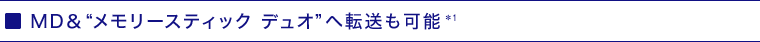 HDDからMD*1へ最大約20倍速*2、“メモリースティック デュオ”(別売)*1へ最大約50倍速*3で転送できます。お気に入りの曲をスピーディーに持ち出して、“MDウォークマン”や音楽再生機能付き携帯電話など*4で楽しめます。 *1 NAS-M70HD/M90HDのみ対応 |