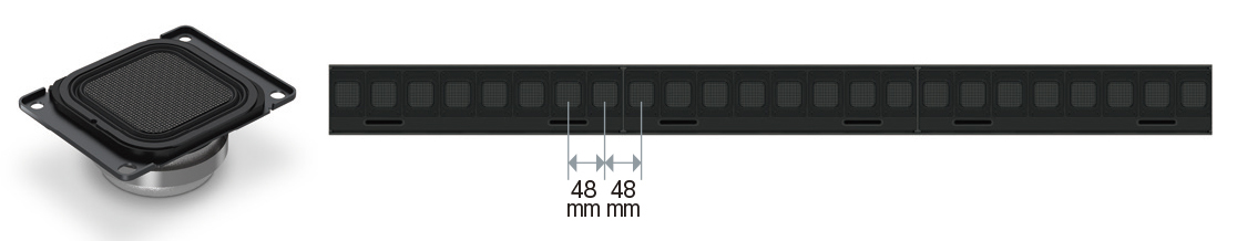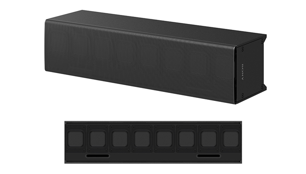 磁性流体を用いて振動板を支えるダンパーレス構造により、クリアで伸びのある高音質を実現する磁性流体スピーカーを8つ搭載しています。また、幅384mm×高さ92mm×奥行き110mmの小型な筐体に、DSPと最大出力10Wのアンプを8ch内蔵しています。搭載する8つのスピーカーは、わずか48mmという狭さで等間隔に並べることで、音の歪みを抑えるだけでなく高精度なビームコントロールを可能にしています。