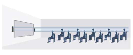 ラインアレイスピーカーは、複数のユニットを線状に連結して構成します。音源を一列に並べることで、垂直方向※1への音の広がりと距離による音の減衰を抑えます。壁や天井からの音の反射を受けにくく、明瞭な音を遠くまで届けることができるため、企業のエントランスやショールーム、会議室や教育機関など視聴エリアの広い場所で多人数に音を届けるのに適しています。