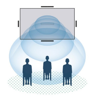 大画面ディスプレイの上下に横配置で本機を設置し、ファントム(仮想音源)スピーカーを生成できます。画面内に音を定位させ、映像と音が一体となった視聴体験を提供します。本機能は、上下に設置したそれぞれのラインアレイスピーカーから視聴位置までの距離を測定し、その距離の差分を遅延量として設定したうえで、視聴する位置に合わせてイコライザー(周波数特性)およびゲイン(音量) を調整することで実現します。