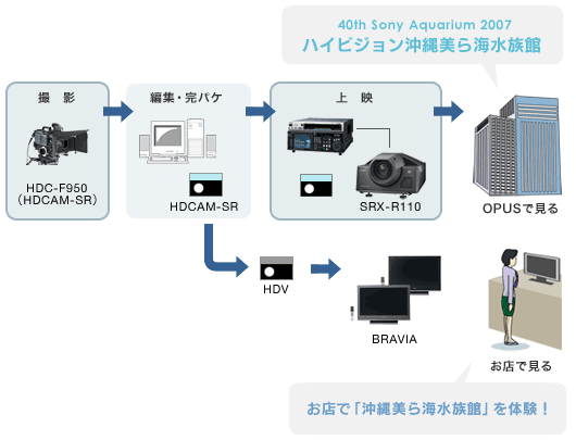 「ハイビジョン沖縄美ら海水族館」の特別映像撮影には、放送業務用HDカメラHDC-F950が使用されており、HDCAM-SRで記録・編集されています。その特別映像は、イベント期間中に東京・銀座ソニービル8FコミニュケーションゾーンOPUS(オーパス)内の4K“SXRD”プロジェクターにて上映されます。ソニーの業務用機材による高精細で臨場感あるハイビジョン映像により、「沖縄美ら海水族館」の大水槽が鮮やかに再現されました。