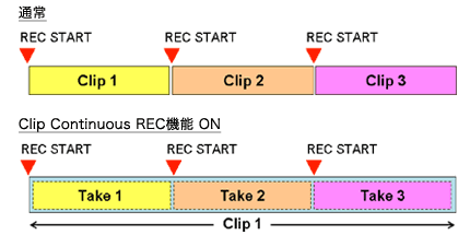 “XDCAM”では通常、RECスタートからRECストップまでを1クリップ単位としてディスク上に記録をします。「Clip Continuous REC機能」では、RECストップ操作を行っても1クリップとはせず、再度RECスタート操作をした場合においても、同一クリップ上に記録を継続していくことが可能になります。