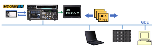 ネットワーク運用に必要なビデオとファイルの相互変換はVTRが行うため、システムを簡素化することができます。VTRがビデオ(“HDCAM-SR”)からファイルに変換して転送を行います。ファイルフォーマットはデジタルインターミディエイト(DI)で一般的なDPXファイルを採用、既存のワークフローに容易に組み込んでご利用いただけます。ファイルは、転送先での作業後、VTRに返送します。その際、DPXファイルからビデオ(“HDCAM-SR”)に変換して、テープに記録したり、非圧縮データフォーマットでテープに記録したりすることもできます。
