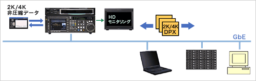 2K/4K(DPXファイル)素材についてもGbE経由で転送を行い、非圧縮データのまま、テープに記録することができます。さらに、その素材をHDモニターでモニタリングすることが可能です。(画質はHD、動きはコマ送りスローのようになります)2K/4K素材のアーカイブやバックアップ用途、またファシリティ間での2K/4K素材交換メディアとして運用可能です。