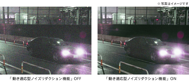 映像内の動きのない領域と動きのある領域に発生したノイズに対して、それぞれ適したノイズリダクションを行なうことにより、鮮明な映像を実現します。低照度の環境などで効果を発揮します。