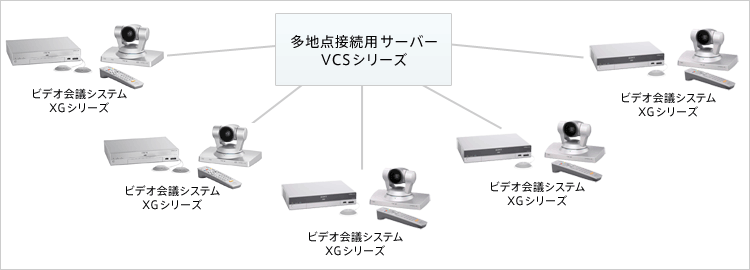 多地点接続用サーバーを利用することで、最大500拠点(単画面)を同時に接続することができ、会議や研修、遠隔講義などで、高品質な映像・音声による映像コミュニケーションと、データシェアリング機能(H.239)を実現します。