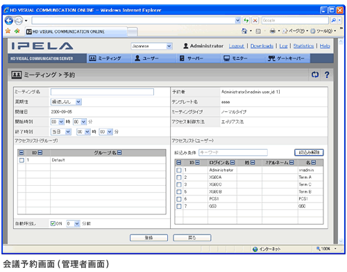 | アクセス制限 | ・ミーティング毎にアクセス制限の有無を設定 ・H.332エリアス、E.164番号、IPアドレスによる制限 ・最大接続ユーザ数の設定 |