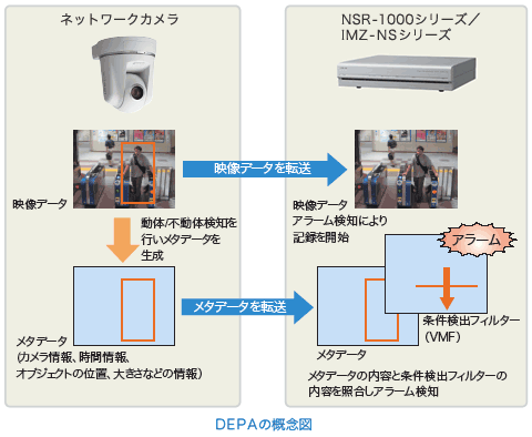 ネットワークカメラレコーダー「NSR-1000シリーズ」またはネットワークカメラレコーディングソフトウェア「RealShot Manager Advanced」とネットワークカメラの間で分散処理を行うことにより、高度な画像処理機能を実現する技術です。