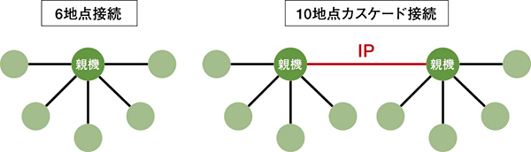別売のHD多地点接続用ソフトウェアをインストールすることで親機となることができます。1台を親機とした場合、最大6地点の同時会議が行え、2台の親機をカスケード接続することで、最大10地点の同時会議が可能になります。