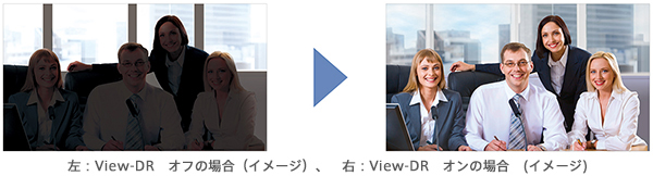 「View-DR」は、1フレーム内でシャッタースピードが異なる複数枚の画像を合成し、同時に明暗部コントラスト補正機能(VE:ビジビリティーエンハンサー)を組み合わせることで、明部/暗部の視認性を飛躍的に向上させるソニー独自のワイドダイナミックレンジ機能です。さまざまな照度環境でも映像の白とびや黒つぶれを抑えます。