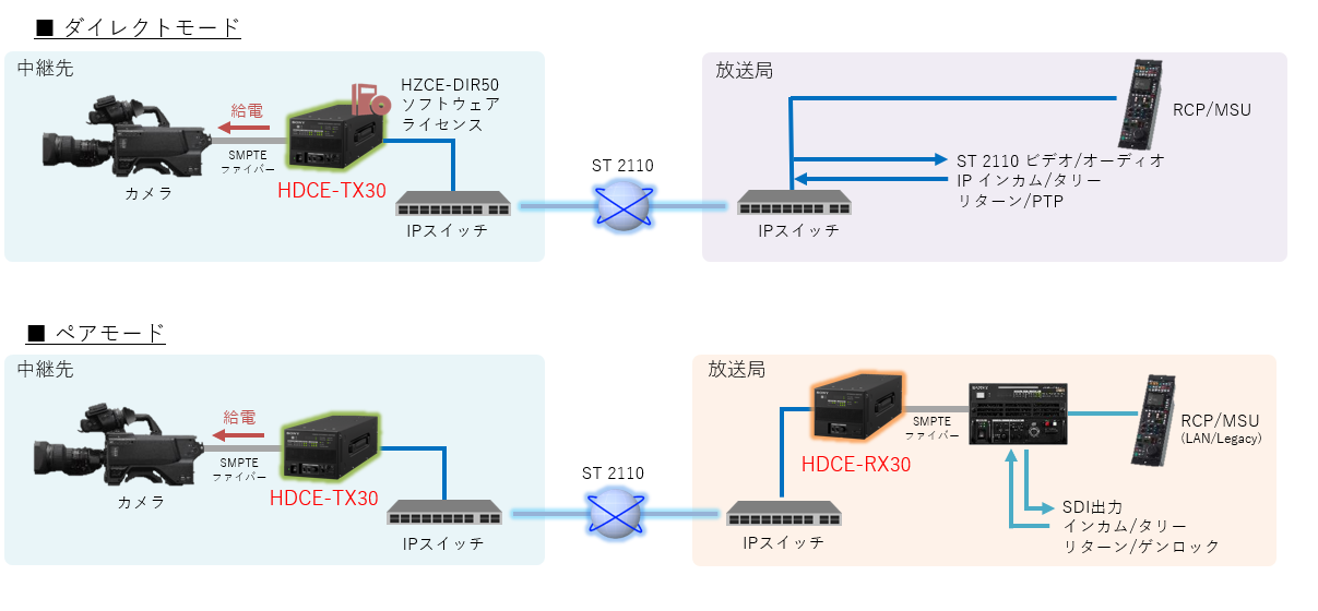 また、IP化した信号とCCUが送受信する信号を相互変換するIP CCUエクステンションアダプター『HDCE-RX30』は、ベースバンドシステムで構築された従来のスタジオシステムなどIP化されていない環境で、新たにIPリモートプロダクションの運用を取り入れる場合に適したモデルです。カメラとCCU間に『HDCE-TX30』『HDCE-RX30』の双方を追加することで、カメラ・CCUをつなぐ距離をIPネットワークで延長できるため、既存のHDCシリーズの局内カメラシステムを生かした運用(ペアモード)が可能です。