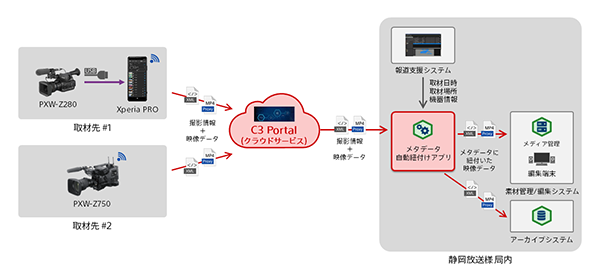 「C3 Portal」とカムコーダー、スマートフォンとの連携により、クラウドを経由して即座に収録素材を伝送することに加え、「メタデータ自動紐付けシステム」により、アップロードした素材に事前に作成した取材メタデータを自動的に付与することで、撮影後に人手を介さず、すぐに編集作業に着手できる新たなワークフローについての有用性を検証しました。
