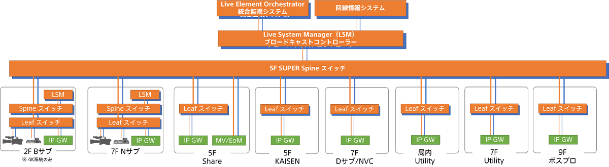 今回受注した回線システムは、「SMPTE ST 2110」を採用しています。朝日放送テレビ様では、既にBスタジオサブおよびNスタジオサブにてNetworked Live(ネットワークド ライブ)によるIPシステムを採用しており、今回受注したシステムは上記サブを含めた局内設備間を接続する回線システムとなります。