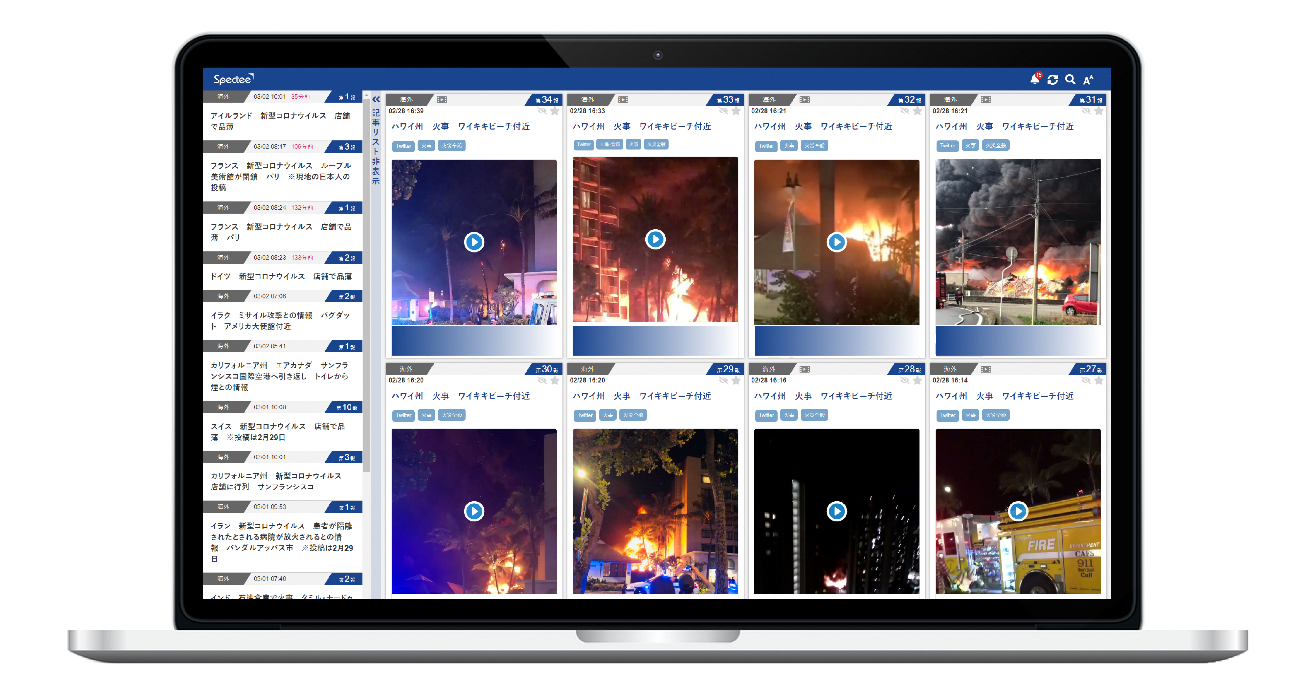 「Spectee Pro」は、株式会社Spectee(本社:東京都千代田区、代表取締役:村上建治郎)が開発した、AIリアルタイム危機管理情報サービスです。TwitterやFacebookなどのSNSに投稿された情報をAIが解析し、災害情報や火災、事故などの100以上の事象と、空港や駅、商業施設といった対象とを掛け合わせて「どこで何が起きているか」をリアルタイムで通知します。