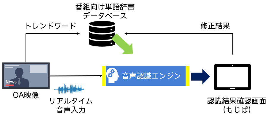 ニュース番組の字幕表示では、状況に応じて素早く字幕を表示させることに加え、人名や時事問題に関するキーワードといった新しい単語を、常に正しく表示させることが求められます。今回のシステムでは、今までソニービジネスソリューションが培ってきた音声解析技術やAI学習データを活用し、放送局で利用されるトレンドワードを再認識させることで、ニュース原稿のキーワードを短時間で学習できる仕組みを取り入れています。また、より正確な字幕を提供するために、AIエンジンと「もじぱ」を連携させ、最終的には人の目を通した確認ができる仕組みを構築しています。今回の実証実験では、新しい単語への学習効果と、音声認識精度を高めることを目指していきます。