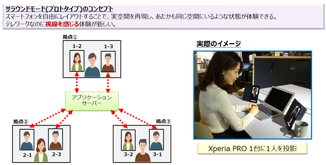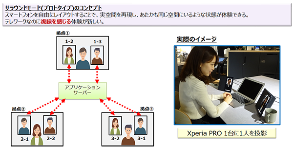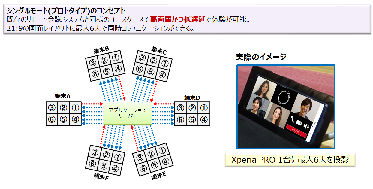 「ANYBODY ANYWHERE(仮称)」には、コミュニケーションの状況に応じて使い分けられる多様なモードが搭載されています。「Xperia PRO」をサブスクリーンおよびローカルセンシングカメラとして活用することで、相手の視線を感じ取ることができる「サラウンドモード」、「Xperia PRO」のアスペクト比21:9、約6.5インチの4K HDR対応有機ELディスプレイの画面を活用し、最大6名を一画面に表示する「シングルモード」、相手がスタンバイ状態にあることをさりげなく伝える「アンビエントモード」など、映像を投影するだけではなく、相手と同じ場所にいるかのような感覚を伝えることを目指しています。