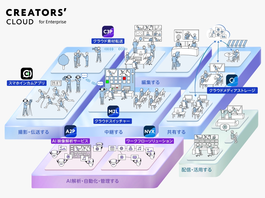 個人のお客様に提供しているCreators' Cloudは、プラットフォーム上にあるアプリケーションを連携・個別に使うサービスに対し、法人のお客様用は、映像制作における各タスクやプロセスに特化して、伝送・配信・共有・管理などの機能スペックなどを充実させ、それぞれ個別のクラウドサービスとしてラインアップしています。また、ソリューションサービスとして、現在ご利用中の他社様製品を含めたソフトウェアの連携・映像AI解析の導入・プラットフォーム化・自動化などをワンストップで提供しています。