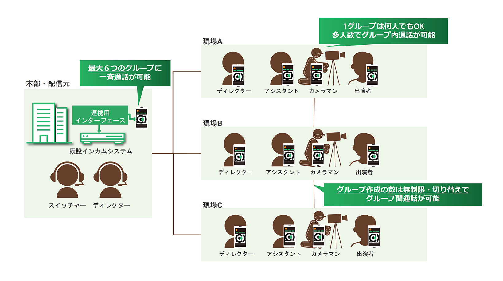 専用のインターフェースを使うことによって、既設のインカムシステムとの連携が可能です。出先の現場など接続距離を広げたい場合や、既設のインカムが不足している際の増設用としてCallsignを追加できます。また、プログラムの内容を聞くこともできるので、スマホで番組の進行状況を確認しながら、コミュニケーションできます。