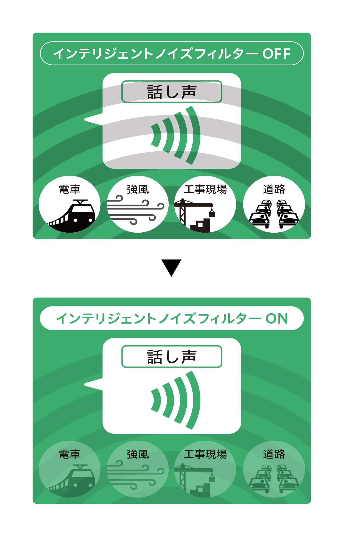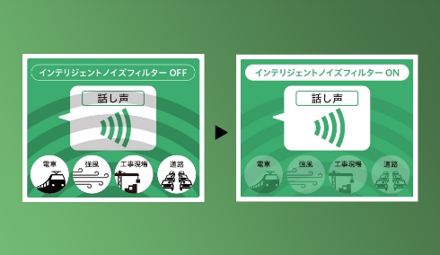 ソニー独自開発の音源分離技術(AI技術)を活用した、人の声と周囲の騒音を分離して人の声のみを残す「インテリジェントノイズフィルター」機能を搭載しました。多くのスタッフがいる中や賑やかな現場でも、周囲の声や騒音などを低減することで、クリアな音質でコミュニケーションを行うことができます。